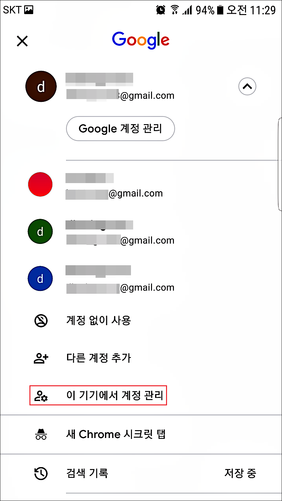 3. 스마트폰의 등록된 계정 이름들이 나오고, 현재 4개의 계정이 등록되어 있습니다. "이 기기에서 계정 관리" 선택합니다.