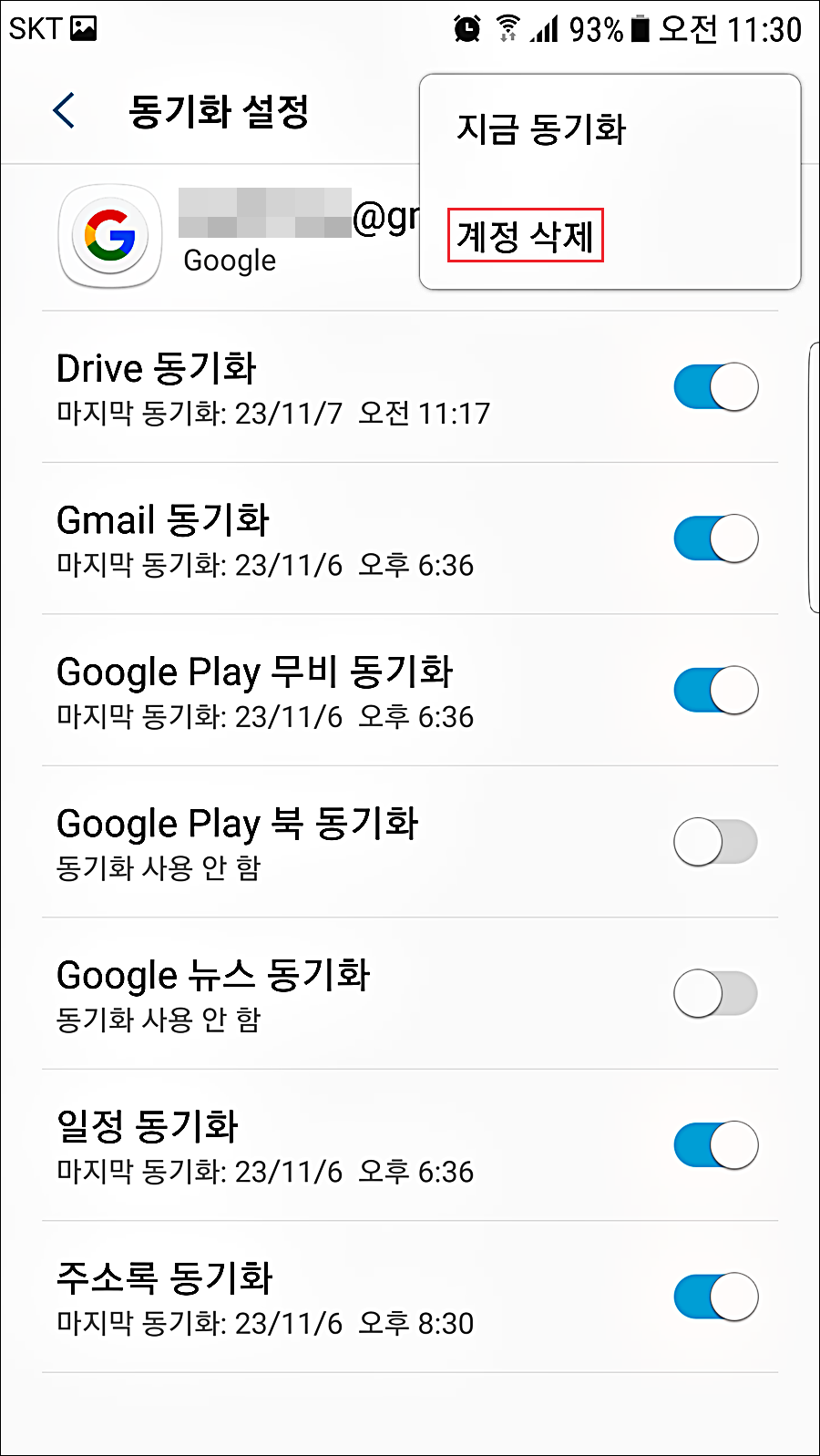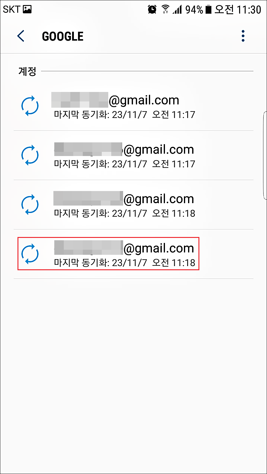 5. 실시간 동기화를 하기 때문에 스마트폰이 종종 버벅거립니다. 삭제하고 싶은 계정을 선택합니다.