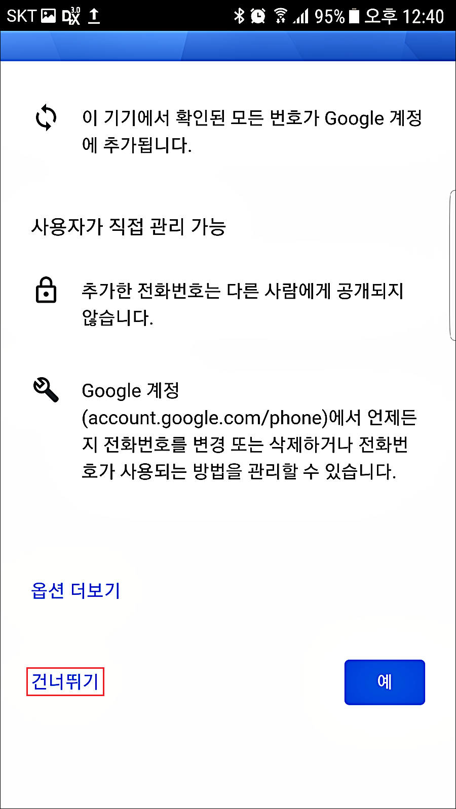 7. 전화번호 추가 안 할 경우 "건너뛰기" 선택합니다.