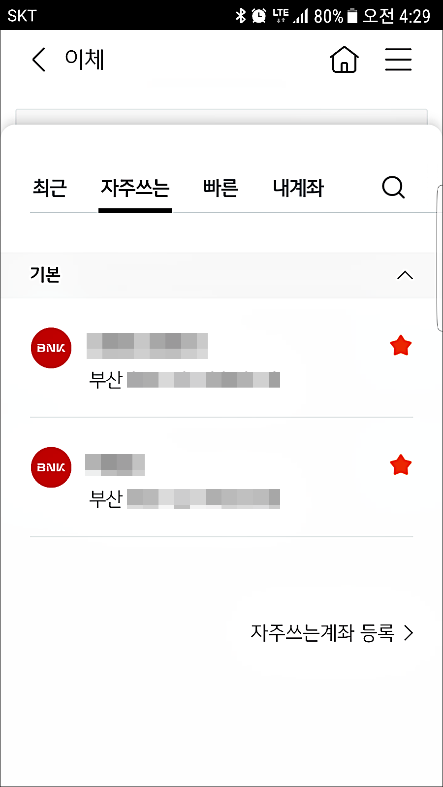 계좌 옆에 있는 별표를 선택하면 자주쓰는계좌로 등록이 됩니다.