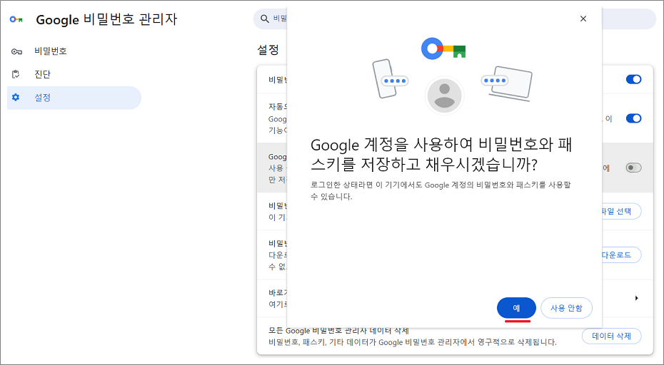 Google 계정을 사용하여 비밀번호와 패스키를 저장하고 채우시겠습니까? 예