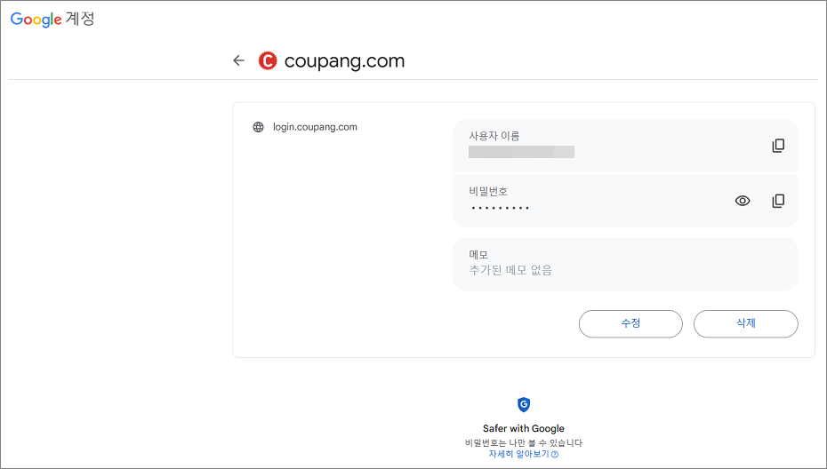 2. Google 계정 사용으로 비밀번호를 저장한 경우는 Google 계정에 저장됩니다.