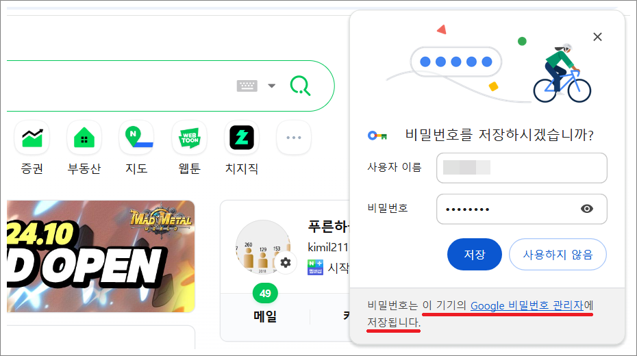 Google 계정에 비밀번호를 저장하는 상태를 나타내고 있습니다.