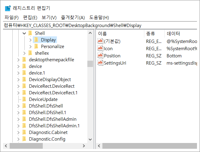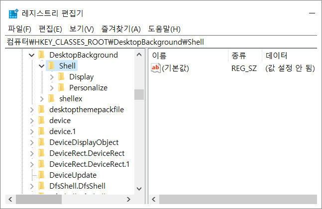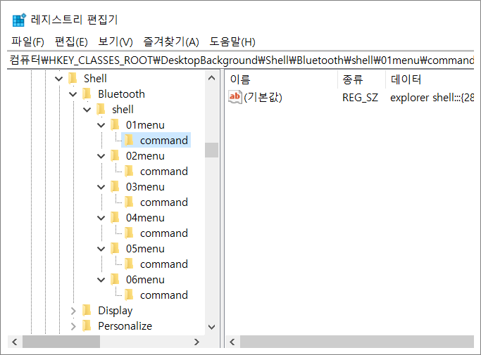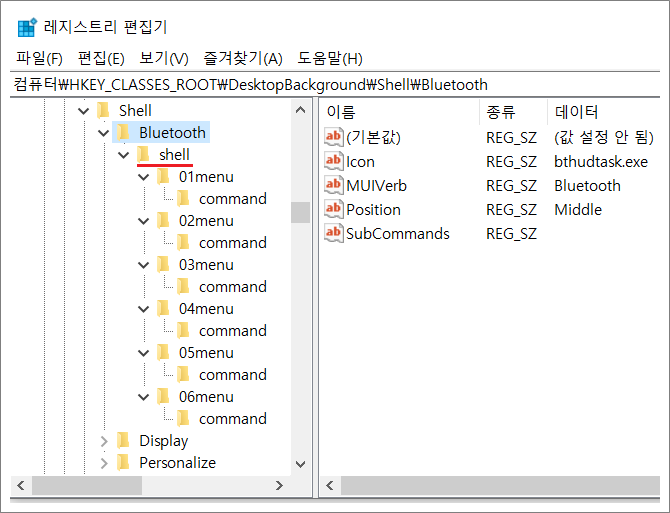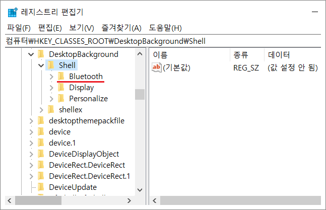⑤. 레지스트리에 들어가서 HKEY_CLASSES_ROOT\DesktopBackground\Shell 들어가니 Bluetooth 폴더는 없습니다.