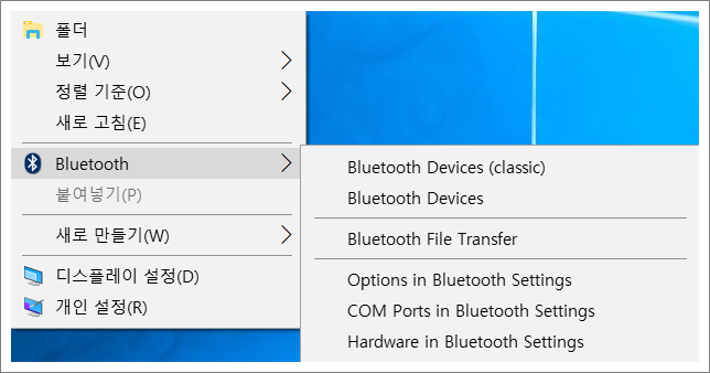 ①. 윈도우10 마우스 오른쪽 메뉴에 블루투스 추가입니다.