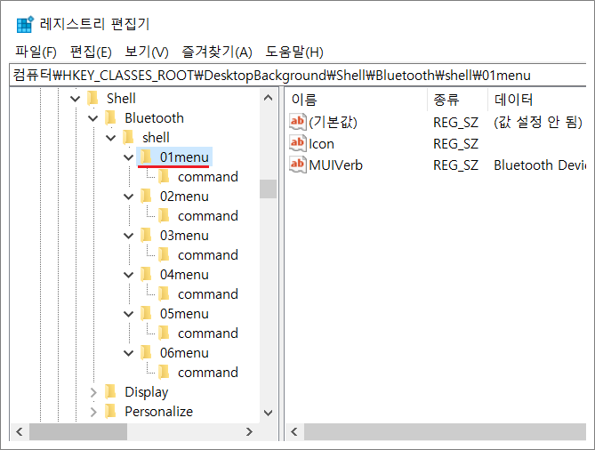 추가 파일의 내용 중에 HKEY_CLASSES_ROOT\DesktopBackground\Shell\Bluetooth 까지는 모두 동일합니다.